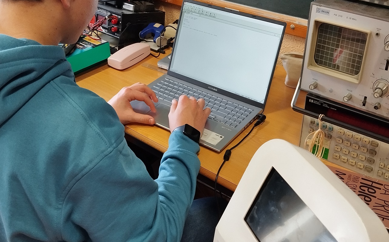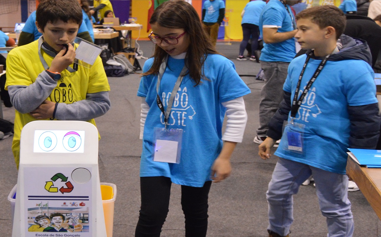 O robô "Gonçalinho" comunica com as pessoas através do movimento dos olhos num LCD e de mensagens de voz, incentivando a participação no processo de reciclagem e sustentabilidade.